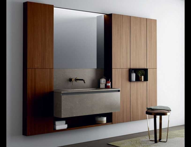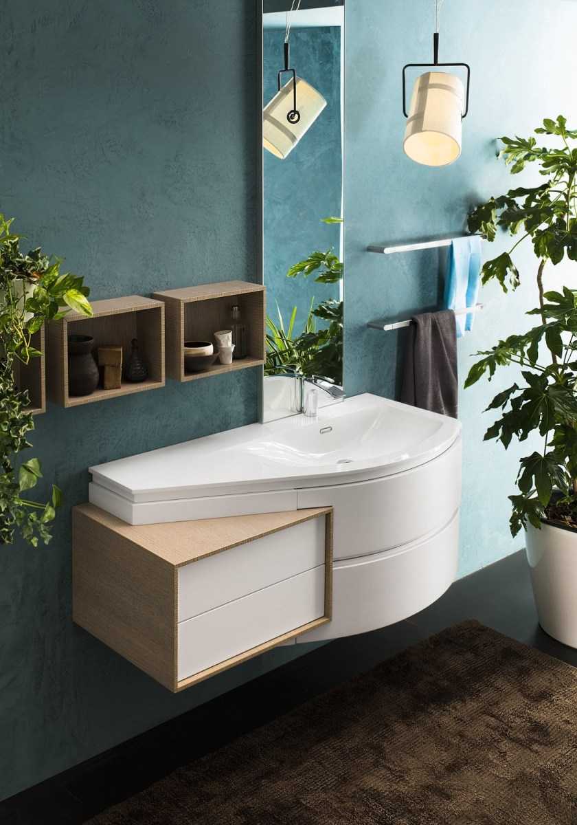 При выборе тумбы под раковину следует учитывать габариты комнаты. Для больших помещений можно выбрать чуть вытянутую по ширине тумбу, которая внесет в интерьер элементы дворцовой роскоши. Для малогабаритных помещений лучше выбирать вертикально ориентированные тумбы. Избежать эффекта загроможденности позволяет сочетание открытых и закрытых полок.