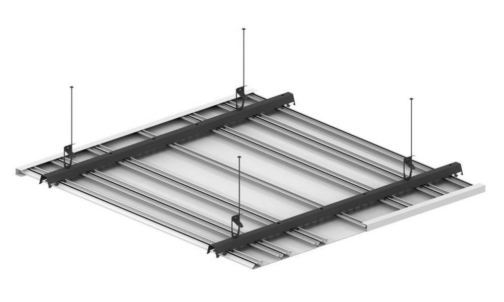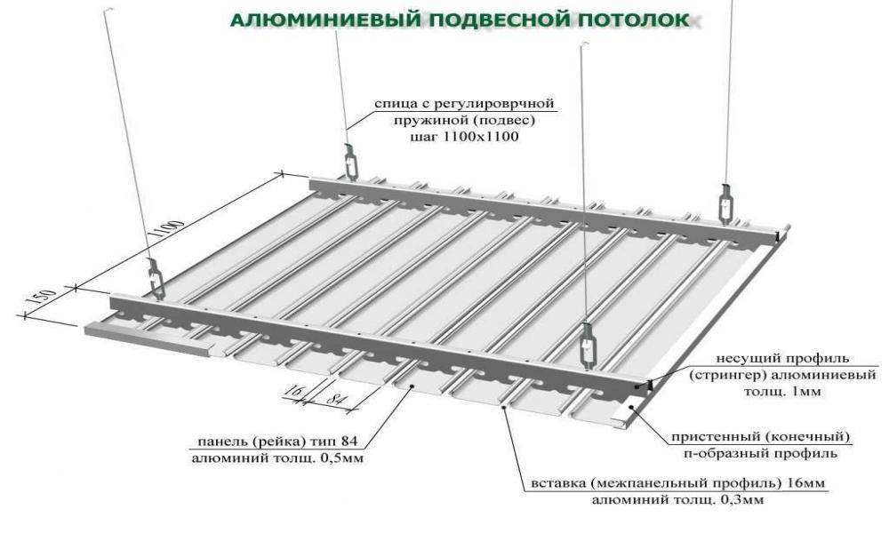 - основные профили – рейки – из них состоит поверхность потолочной конструкции. Чаще всего, когда производится установка алюминиевых подвесных потолков, используют планки, имеющие в ширину 100 миллиметров;