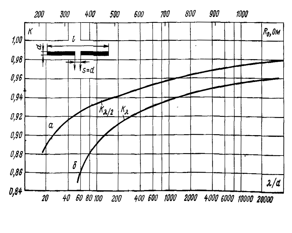 Графика показывает: зависит коэффициент укорочения антенны от отношения длины волны к удвоенному диаметру проволоки, из которой сделан полуволновой вибратор. Придумана иная форма графика, смысл остается прежним. Для расчета удобнее с точки зрения минимизации вычислений. Дана частота 100 МГц, диаметр медной трубки, послужившей материалом, составляет 25 мм. Находим нужную длину полуволнового вибратора, пользуясь формулой.