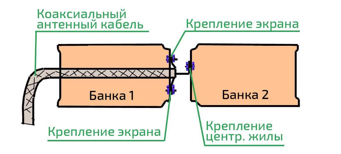 - оплетка и центральная жила должны крепиться к разным банкам.