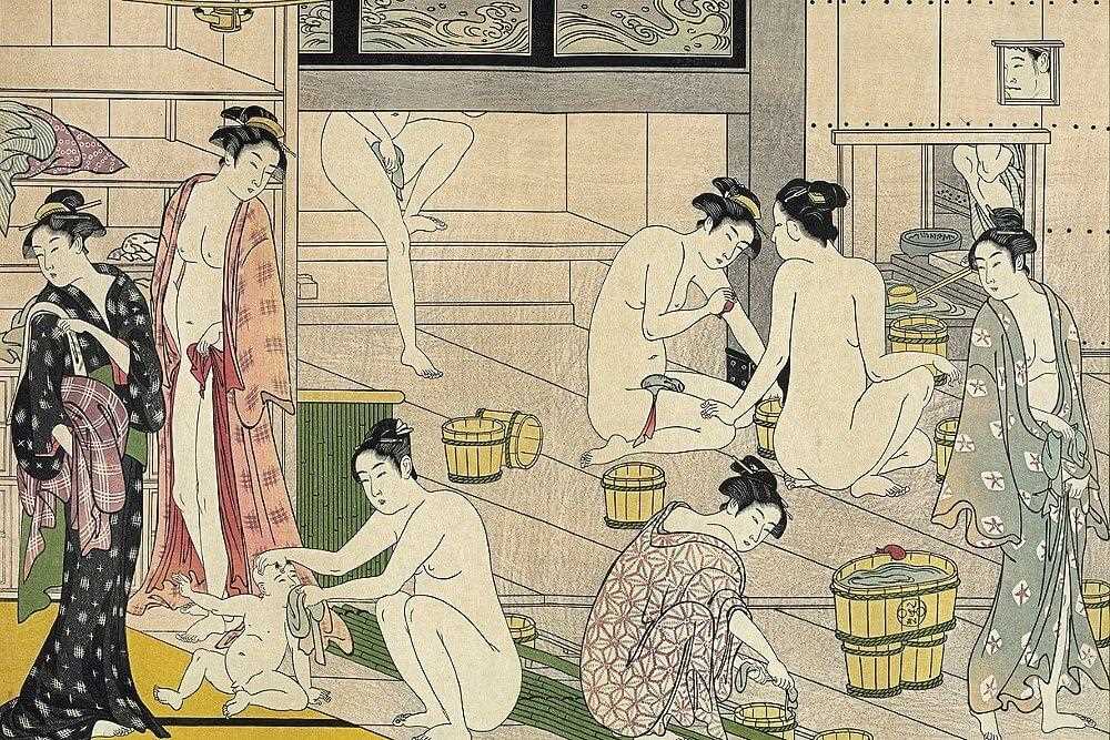 Гравюра с изображением общественной бани Японии в конце девятнадцатого века