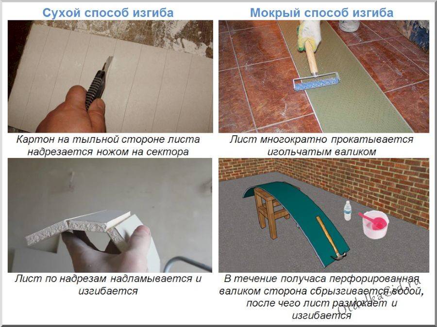 Монтаж криволинейных элементов конструкции требует изгибания ГКЛ с нужным радиусом. Этот процесс выполняется двумя способами – сухим и мокрым.