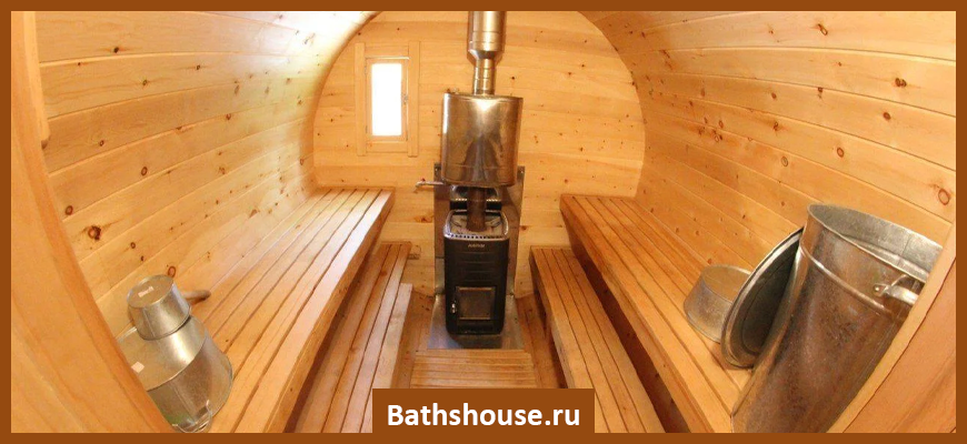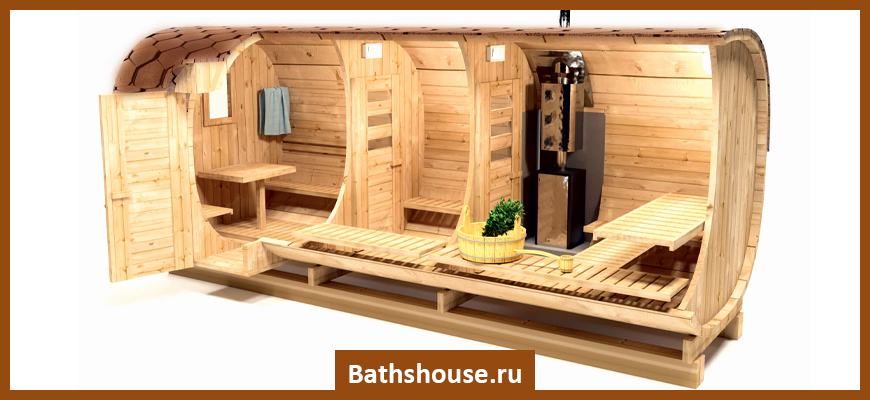 Соорудить конструкцию несложно, если следовать плану, согласно заранее подготовленному проекту. Баня-бочка бывает разных размеров, а также отличается внутренним убранством и породой дерева, которое использовалось для строительства. По форме строение напоминает фигуру цилиндра, уложенного на бок. При желании такую баню можно дополнить козырьком, верандой, а внутри разделить общее помещение на парилку и комнаты для отдыха и переодевания. Бани бочки делают также овальной формы, что позволяет вместить большее количество людей. Самая маленькая баня-бочка предназначена для одного человека и представляет собой только парилку.