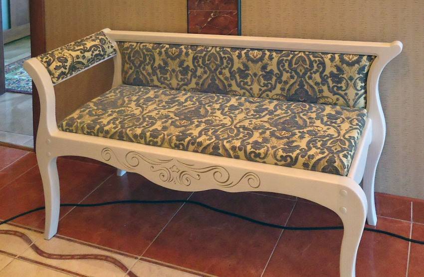 Популярный предмет интерьера легко смастерить в домашних условиях даже человеку, не имеющему богатый опыт в столярном деле. В основе аксессуара лежит скамья, которая впоследствии дополняется мягким сидением, декорируется завитками, фурнитурой и другими деталями.