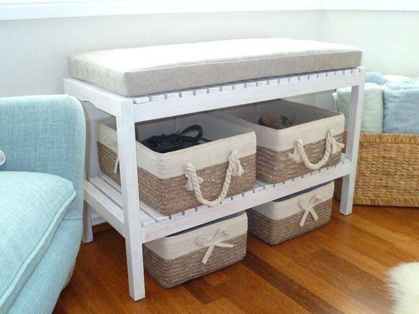 Деревянная банкетка с декоративными ящиками для обуви имеет очень оригинальный вид