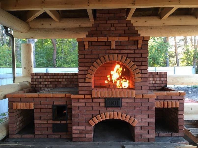 Подобные сооружения позволяют одновременно готовить разные виды пищи, что дает им дополнительные возможности. Как правило, подобные сооружения строят из кирпича. Это самый простой и надежный вариант, позволяющий получить внешне привлекательный и удобный в использовании комплекс.