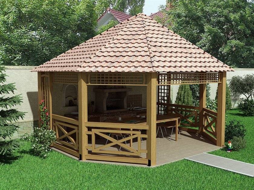 Это сложная форма беседки. Для ее строительства необходимо продумать схемы и чертежи. Как правило, такие беседки имеют шесть или восемь углов. Такая сложная постройка придаст солидность приусадебному участку.