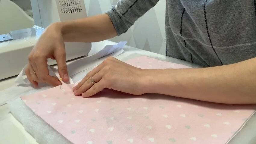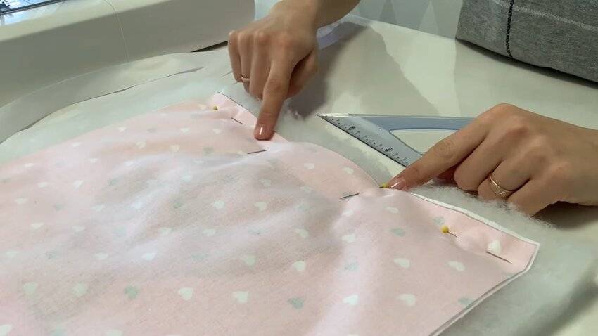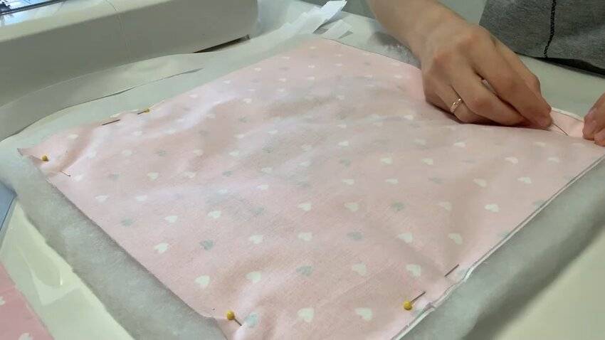 | 4 | ![]() | То же самое проделайте с противоположной стороны. И зафиксируйте изделие иголками по всему периметру, чтобы удобнее было прошивать. |