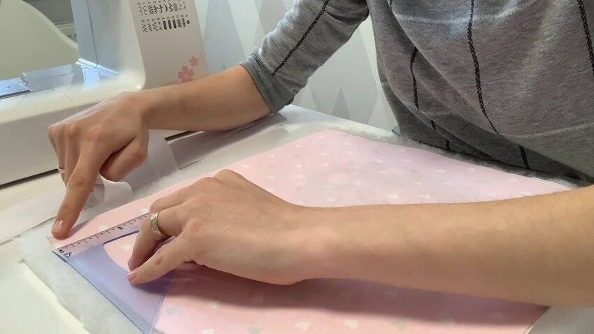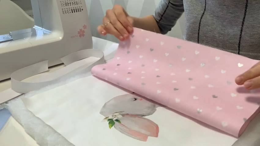| 1 | ![]() | Для начала на лист синтепона наложите панель и накройте заготовку отрезом другой ткани. Квадраты должны располагаться лицевой стороной друг к другу. |