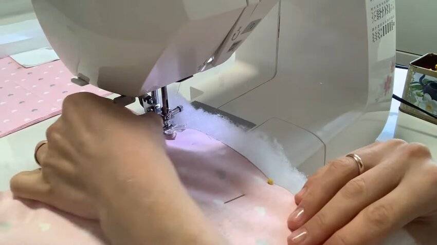 Складываем ткань пополам лицевой стороной друг к другу. Прошиваем по кругу, оставив небольшое отверстие для того, чтобы можно было вставить наполнитель. После того как наш наполнитель окажется внутри чехла, потайным швом зашиваем оставшееся отверстие. Такие манипуляции проводим в отношении каждой детали.