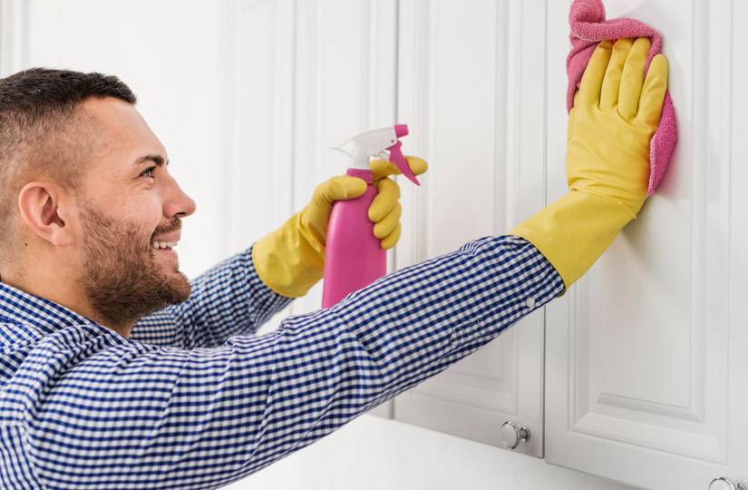 Чем чаще вы будете протирать кухонные шкафы, тем меньше времени в итоге займет уборка. Верхние поверхности под потолком лучше застилать пленкой или старыми газетами, меняя их время от времени. Так вы избежите утомительного оттирания толстого слоя жира с горизонтали. С отдельными жирными пятнами на фасадах легко справится меламиновая губка.