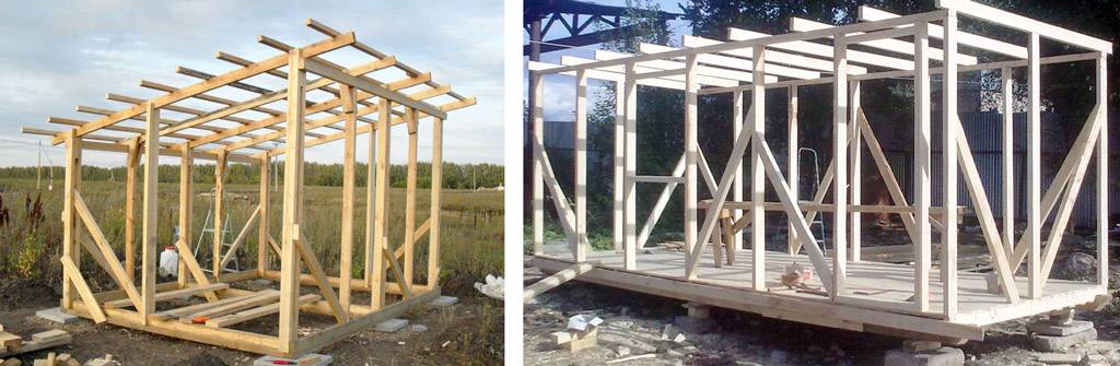 В каркасных зданиях эксплуатационные нагрузки берет на себя прочный жесткий каркас. Для такого простого строения, как бытовка, он оказывается также недорогим и мало трудоемким. Каркасные бытовки строят либо «от клетки», слева на рис. – пол настилают в уже собранном каркасе – либо «клетку» из силовых связей собирают на прочном основании, справа там. Последнее требует несколько больше труда и материалов, но меньше умения, поэтому далее мы подробнее остановимся именно на этом способе.