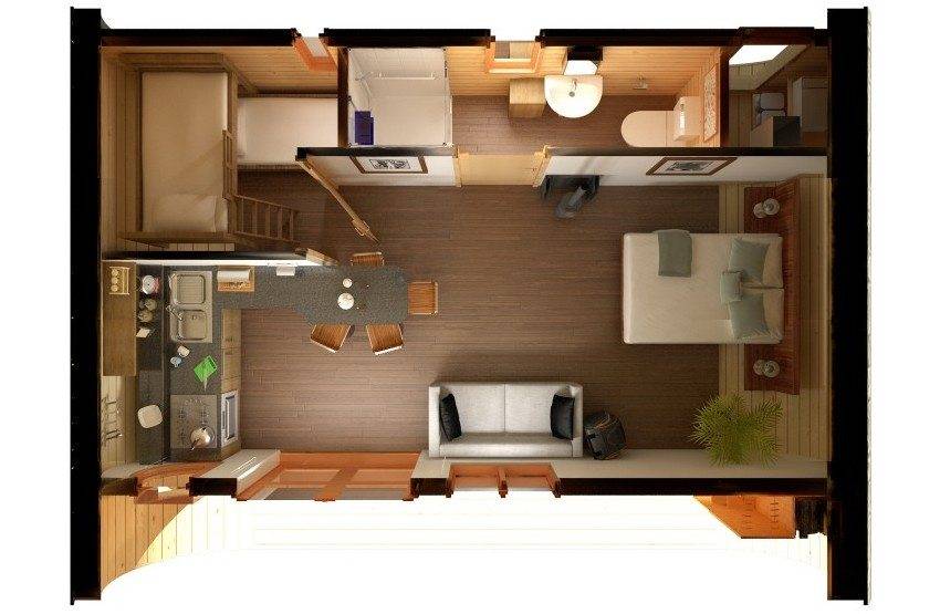 Для одного жильца идеально подойдет домик с простой планировкой, такой как на схеме ниже. Одноместное жилище может стать домиком сторожа или охранника на объекте со своей территорией.