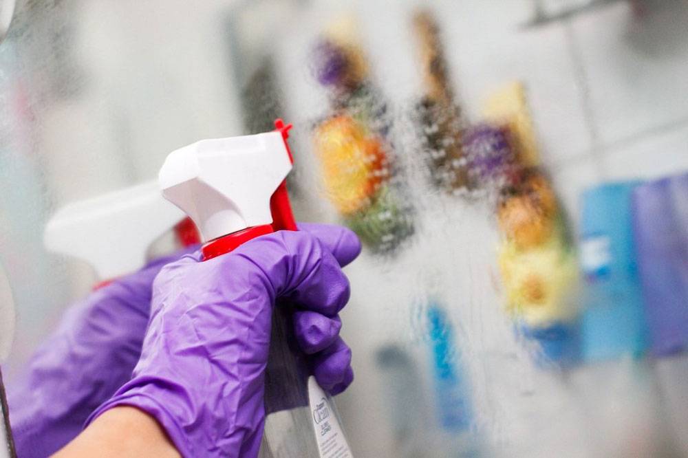 Состояние стекол – первое, что замечают при посещении ванной комнаты, поэтому стоит уделить им особое внимание. Для чистки подойдут покупные средства (Clin, Meine Liebe), достаточно просто распылить их по поверхности и оставить на указанный на упаковке срок, а затем смыть