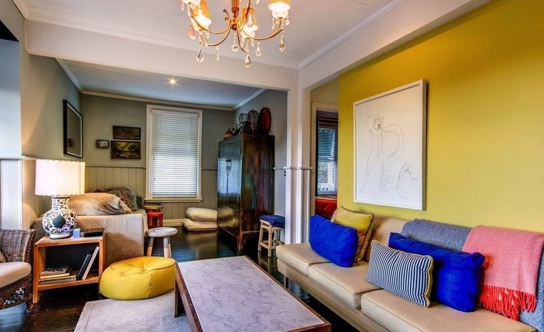 - Энергичные цвета — фиолетовый, оранжевый, бордо дополнят горчичный и привнесут элементы вкуса и стиля. Часто такие сочетания используются в общественных помещениях.