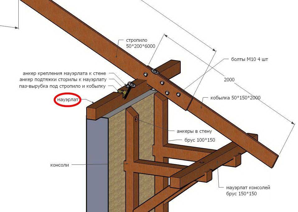 То же самое касается конструкции односкатной крыши. Для тихой местности можно строить односкатную крышу без использования балок потолочного перекрытия, но в этом случае верхнюю обвязку стен и мауэрлат потребуется подпереть дополнительными вертикальными опорами из бруса. Для ветреной местности односкатную крышу необходимо обязательно усилить балками перекрытия и опорами в срединной части стропил.