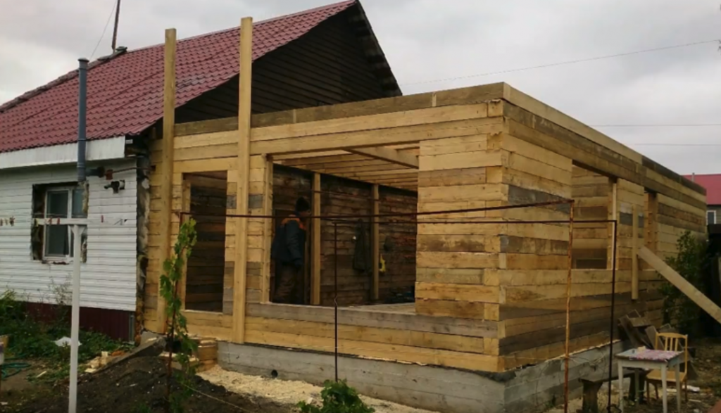 Возле дома пристроена веранда из белого кирпича (фундамент ленточный) здание не большое 3 на 4 метра и высотой 3 метра.