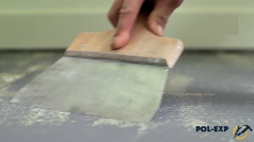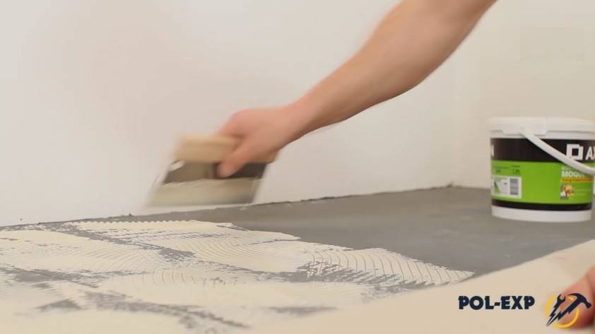Далее нужно продумать, как лучше зафиксировать полотно к полу. Если комната не слишком большая, до 20 м2, можно применить двусторонний скотч. На площади до 12 м2 скотч крепится только по периметру, от 12 до 20 м2 – по периметру и параллельными полосами через каждый метр. На большой площади рекомендуется использовать специальный клей, например, Момент универсальный, Homakoll, FORBO Eurocol 525.