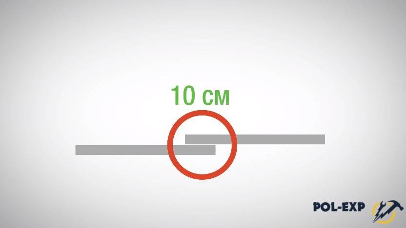 Шаг 4. Для качественной стыковки смежные полотна укладывают внахлест на ширину 10 см и под линейку прорезают оба слоя по всей длине.