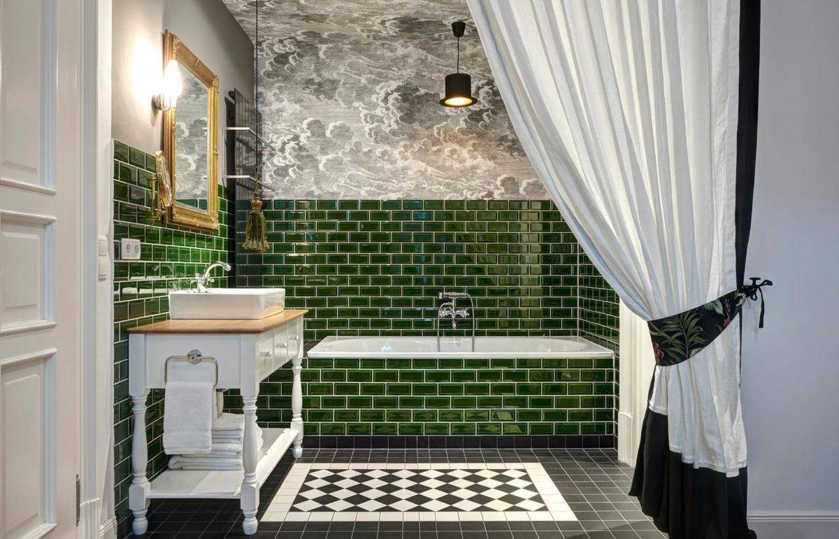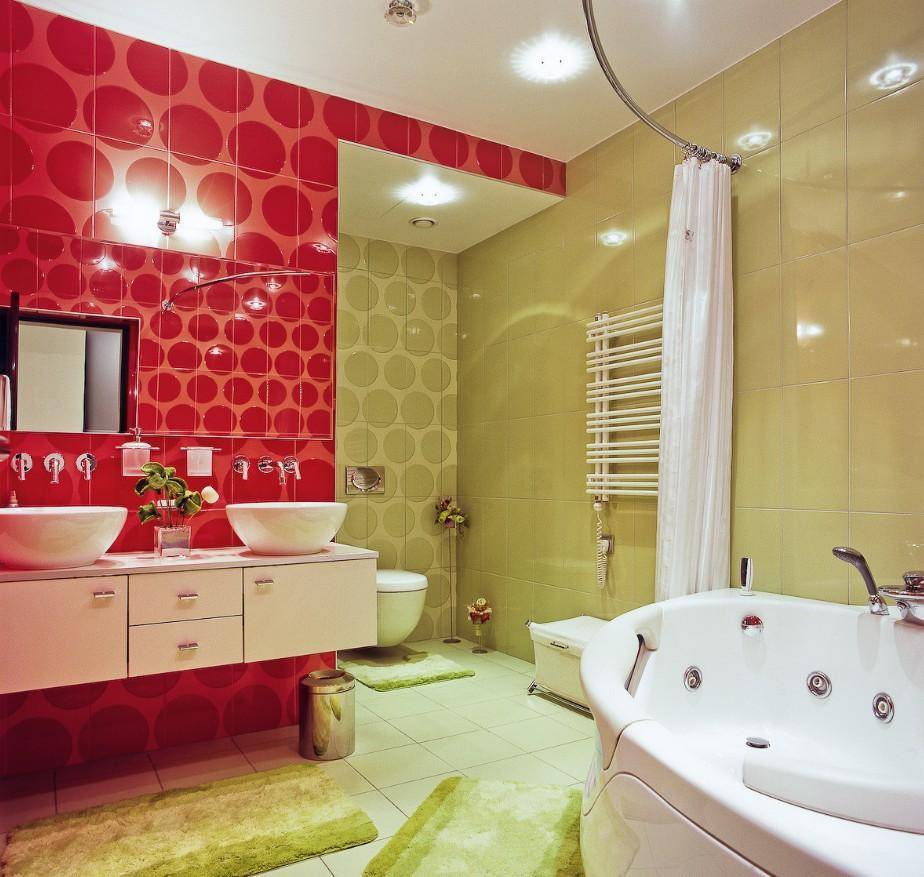 Изумрудная (тёмная) ванная комната потребует гораздо больше электричества, чем светло-зелёная. В санузле светлых тонов достаточно одной люстры. В других случаях применяются: