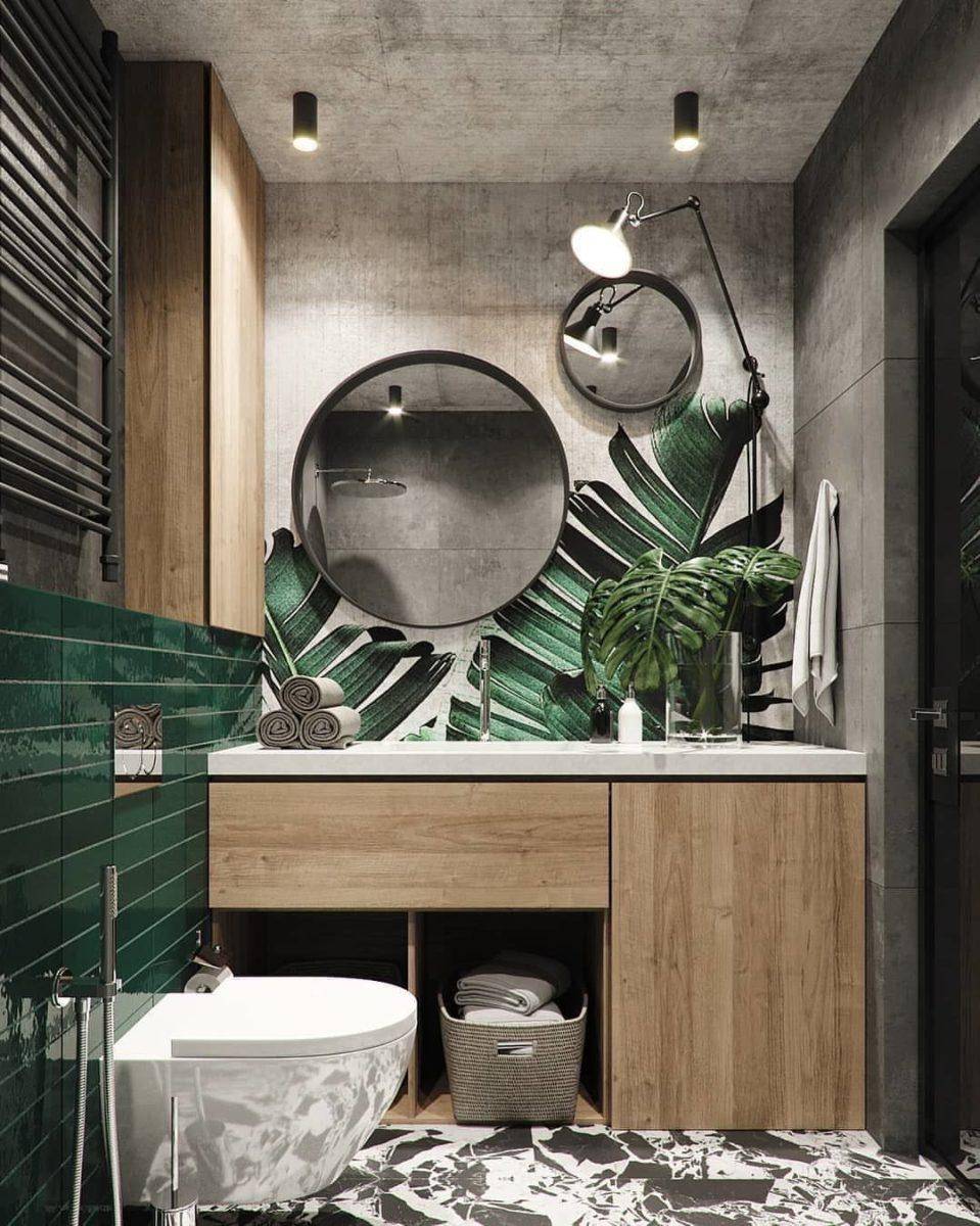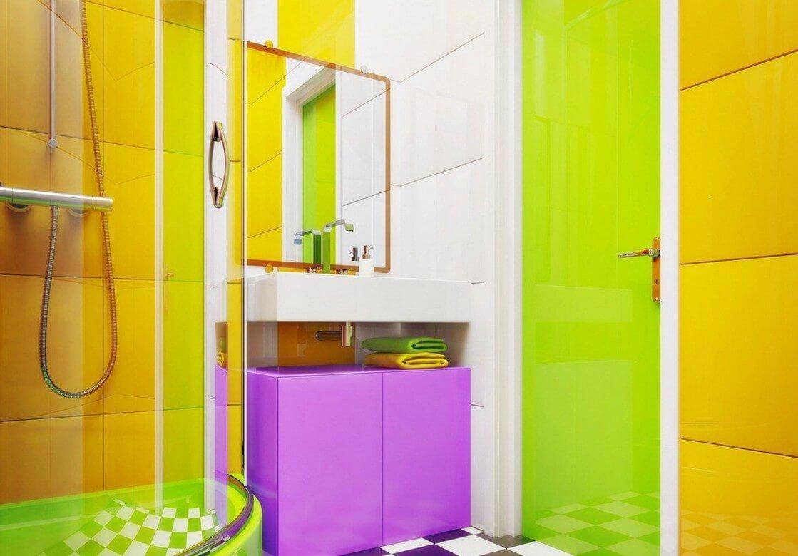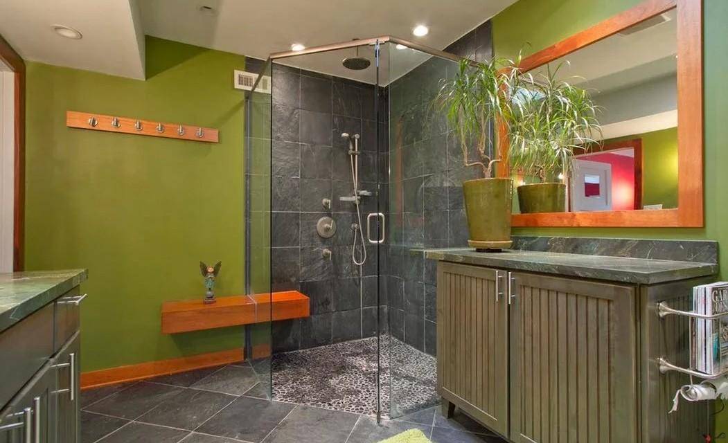 - аналоговые комбинации — простое сочетание двух близлежащих цветов. Например, бутылочный + синий, хаки + охра. Оформители рекомендуют третьим добавлять ахроматический оттенок. В салатовую ванную комнату просится белизна и лучики солнца, травянистую палитру оттенит графит или мокрый асфальт;