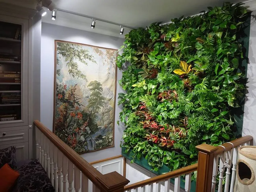 Декоративная живая стена из разных растений над лестницей в двухэтажном частном домеИсточник dekormyhome.ru