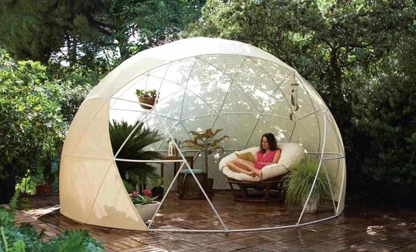 Свежо и ярко смотрятся футуристические тренды. Например, куполообразные стеклянные беседки или ломаные многоугольные конструкции из металла и тонких планок.