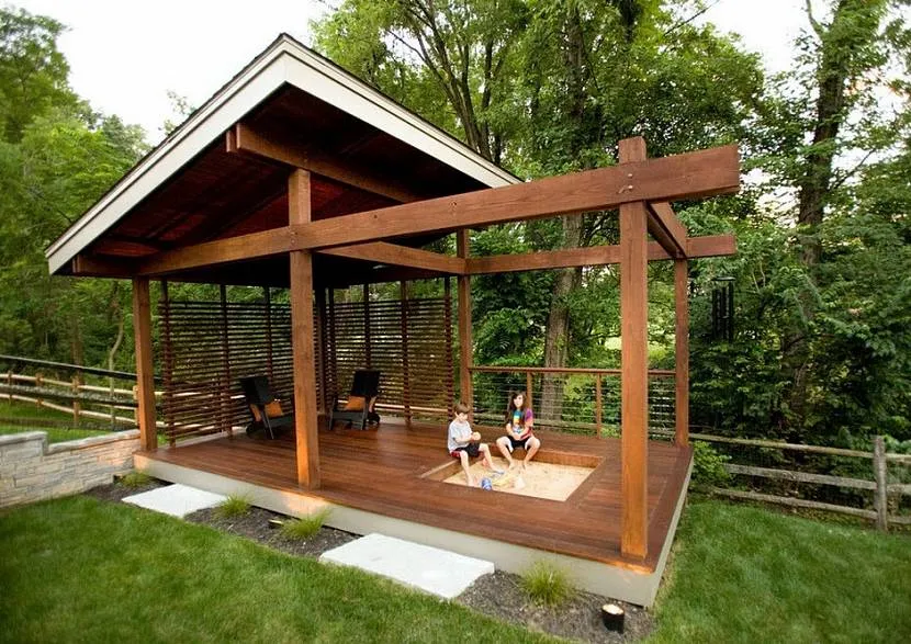 Беседка идеальный-вариант-для-любящих-родителей — просторная, натуральная и с песочницей.Источник pinterest.at