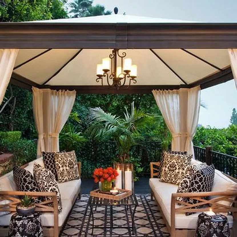 - Восточный дизайн предусматривает легкость и воздушность оформления за счет использования тканей и ажурных металлических элементов. Восточный стиль. Один из популярных стилей для тех, кто хочет выделиться и создать на дачном участке уникальное сооружение с удивительной атмосферой. Размер и материал зависят от предпочтений владельца. По центру часто устанавливается низкий столик, окруженный множеством подушек. Использовать для оформления лучше современный полиэстер, он отталкивает влагу, и дождь будет не страшен. Вся мебель и предметы декора должны соответствовать выбранному направлению. Отлично смотрятся восточные беседки на фоне водоема.