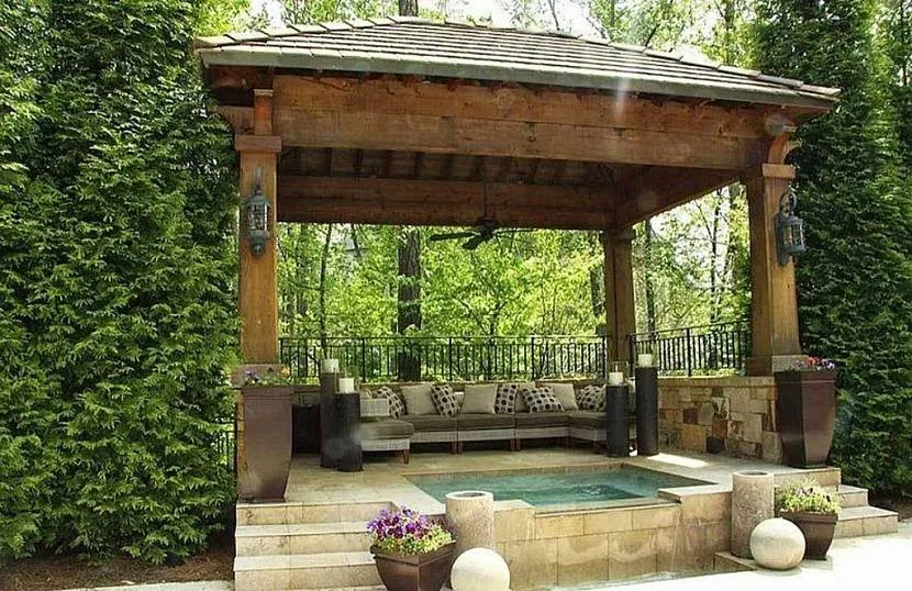 - беседка, как укрытие. Нет-нет, здесь не идет речь о бомбежках – здесь имеется в виду проливной дождь и палящее солнце;