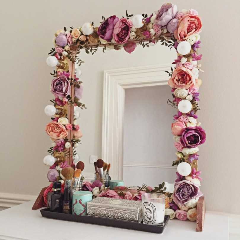 Зеркало можно украсить искусственными цветами. Вы можете взять цветы разных размеров и приклеить их в произвольном порядке. Промежутки между ними можно заполнить бусинками, пайетками, блестками или бисером. Зеркало, украшенное таким образом, красиво будет смотреться в спальной комнате.