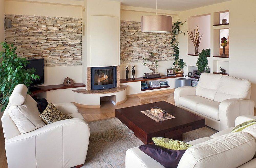 Камень ассоциируется с надежностью и безопасностью. Если он присутствует в гостиной – домочадцы чувствуют себя уверенней, «как за каменной стеной».