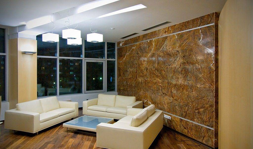 - В гостиной идеально подойдет мрамор, который можно положить на стену за телевизором или за диваном,