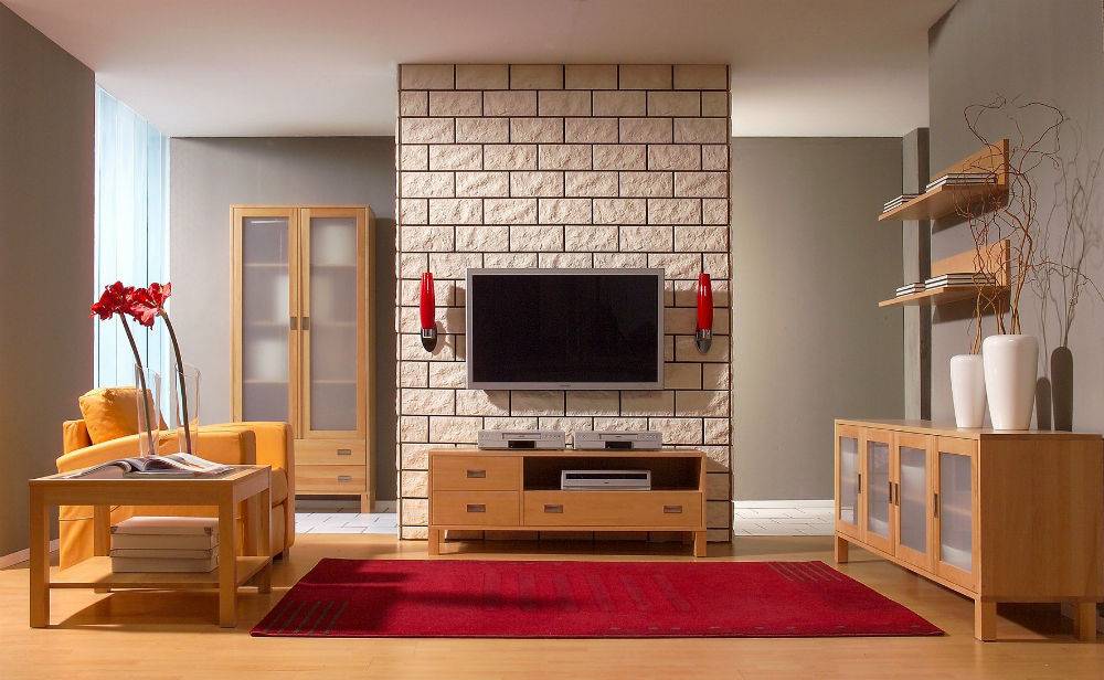 - отличным фоном для большого телевизора в гостиной станет декорирование части стены. Если в комнате есть камин, то и его можно облицевать таким материалом. Это беспроигрышный вариант, несущий мощнейшую стилистическую нагрузку;