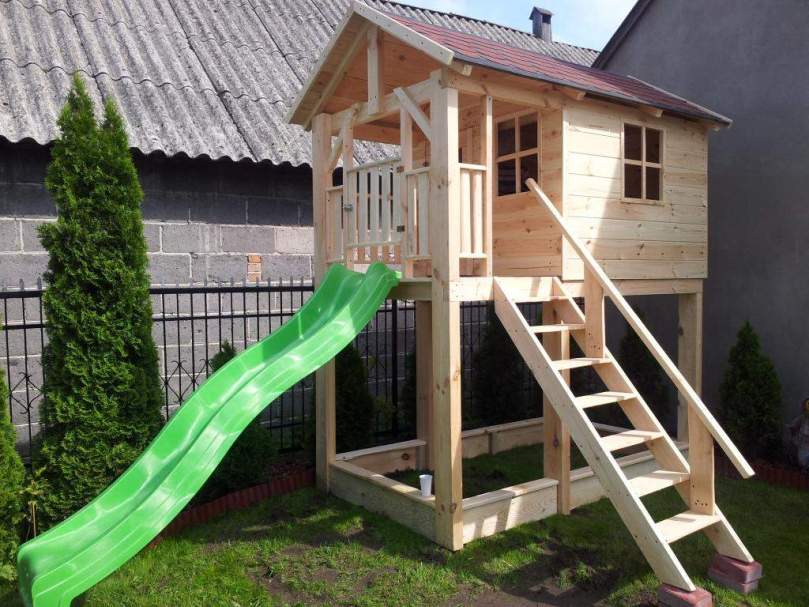 Перед нами изображение самодельной горки с фабричным спуском из пластика. Если раскрасить домик в яркие цвета, получится очень интересно.