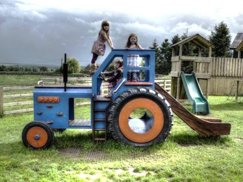 На другом краю фантазии – почти настоящий трактор с горкой. Место ему — где-нибудь на задворках, а детей – не отгонишь… Однако потрудиться над такой поделкой придется серьезно.