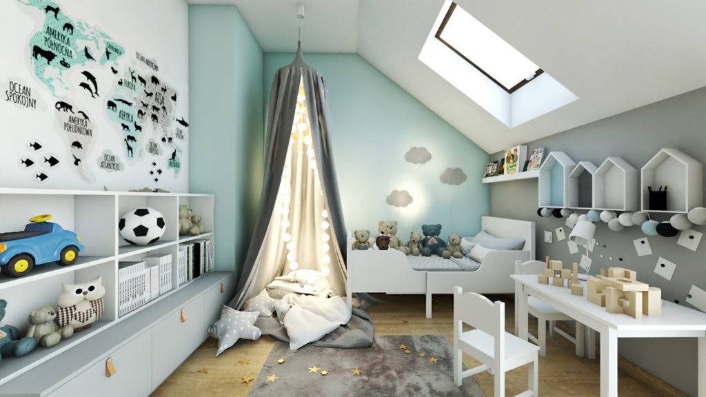 Обязательно надо выделить области для сна, игр, учебы. Сегменты можно отделять с помощью цветовых решений, разных уровней.