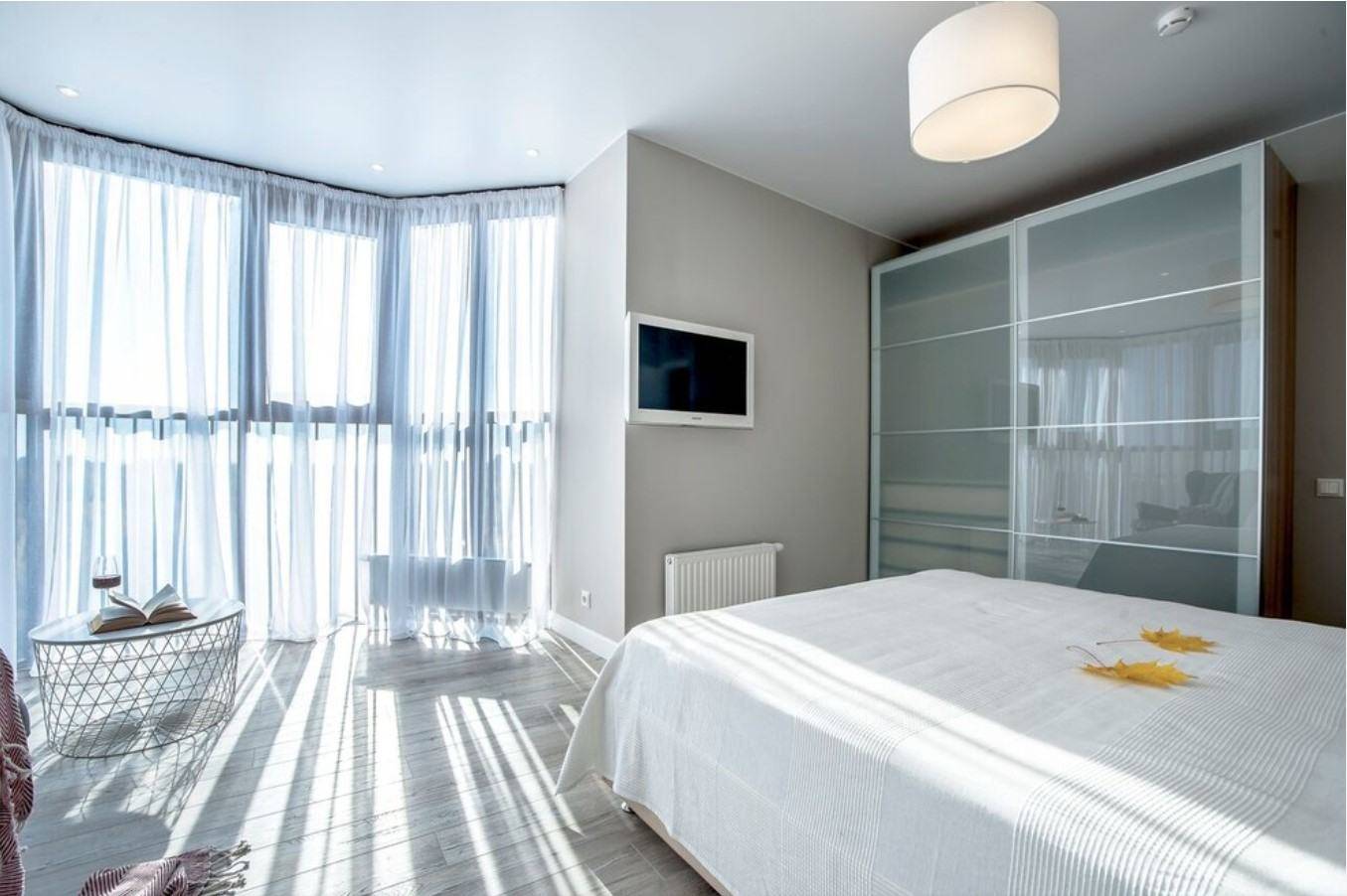 В квартире сделана небольшая перепланировка: гостиная объединена с кухней, а часть спальни превращена в гардеробную. Проведены работы по утеплению лоджии.
