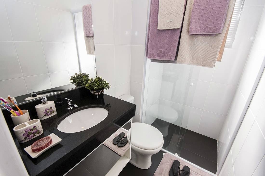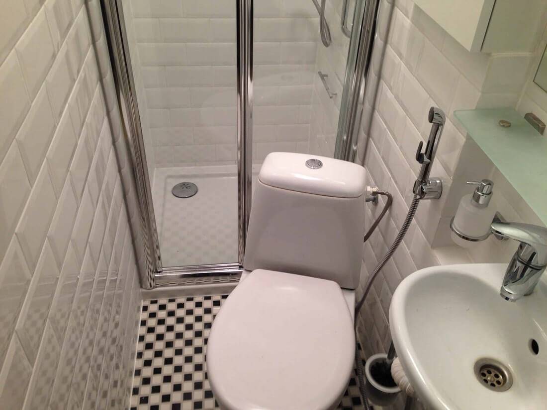 Санузел в маленькой двухкомнатной квартире не может похвастаться большой поверхностью. При отделке стен необходимо избегать контрастных переходов, чтобы зрительно не уменьшать и без того небольшое пространство. Отказ от ванной комнаты в пользу душевой кабины, небольшой раковины и узкой стиральной машины под ней поможет сэкономить квадратные метры.