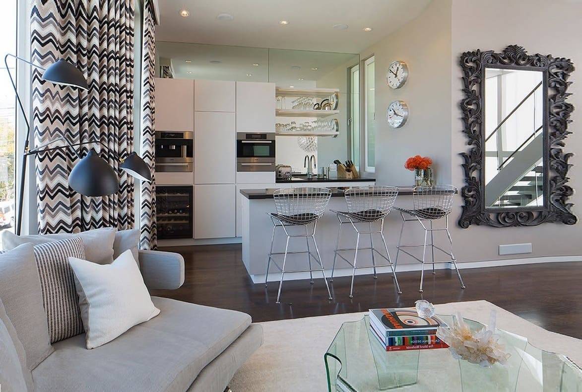 Использующийся за рубежом вариант зонирования кухни и гостиной – барная стойка. Она не занимает много места, выглядит стильно и уместно в любом интерьере. Но такой предмет мебели дорог и не всегда практичен, поэтому для разграничения пространства чаще используют стол или несколько тумб.