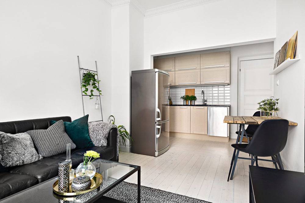 На такой площади уже не так тесно. Вполне реально оборудовать хорошую кухню и жилую комнату. В этом случае можно разделить квартиру на части с помощью перегородки из гипсокартона, и получить коридор, кухню и комнату.