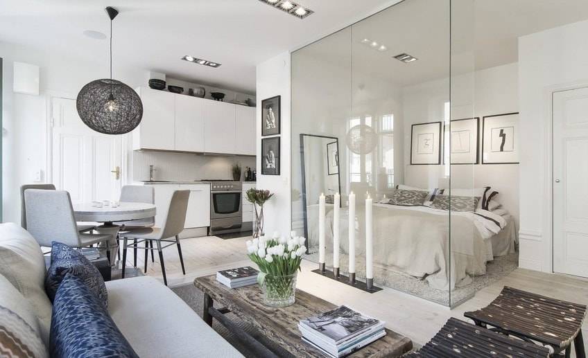 Совет №3. Соорудить отдельную комнату в квартире-студии с маленьким метражом без потери зрительного пространства возможно при помощи стеклянных панелей. Идеальным вариантом для такой комнаты станет спальня или рабочая зона кухни.