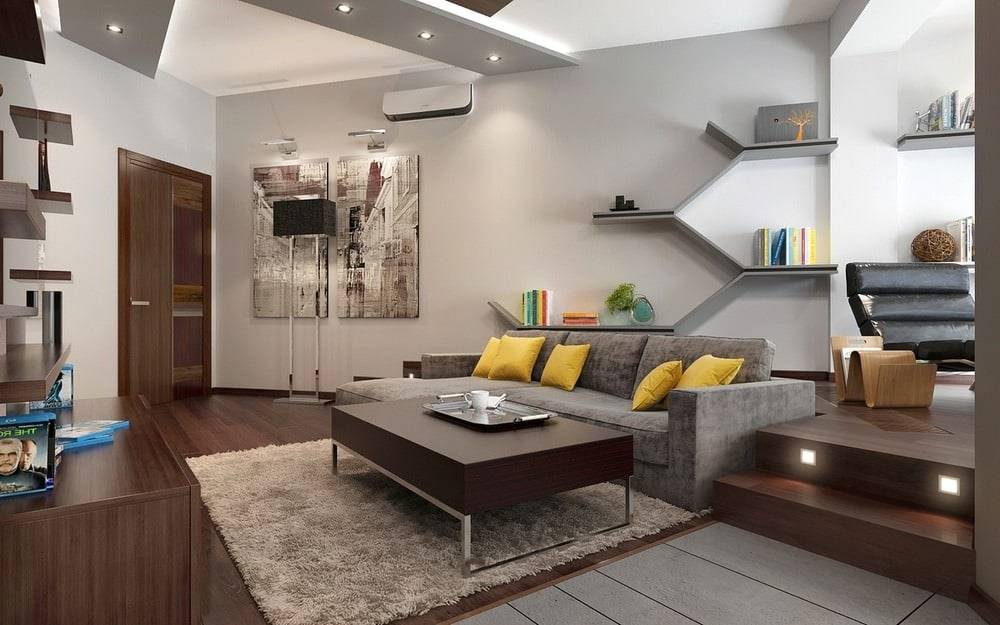 Если все же нам хочется сохранить свободное пространство, оставим все как есть, разграничив квартиру элементами дизайна: разноуровневым потолком и полом, цветовой гаммой и освещением.