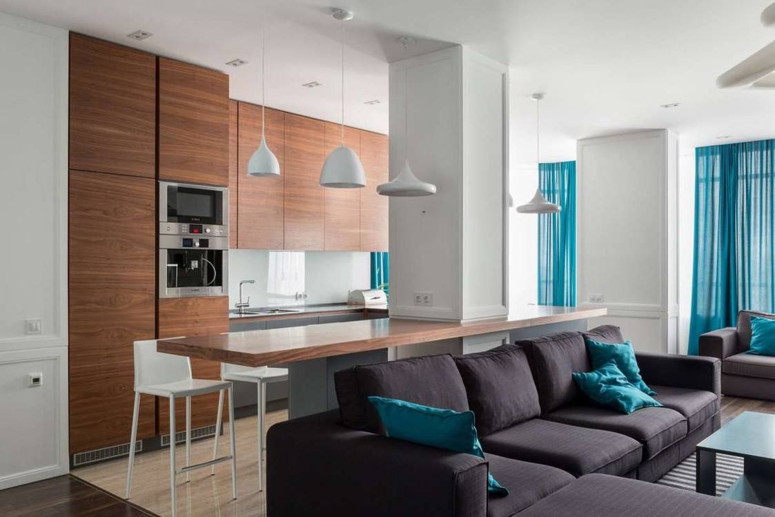 В этом случае идеальным вариантом будет сделать свободный проход в виде стилизованной арки, это облегчит подачу блюд для гостей, и в целом увеличит вентиляцию кухонного пространства, станет значительно больше места. Рассмотрим детальнее как обставить каждую комнату.
