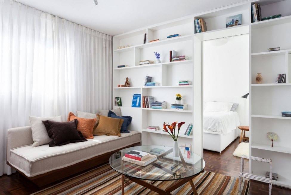 Вы можете вместо стационарной перегородки для разграничения пространства на функциональные зоны выбрать сквозные стеллажи и консоли. Благодаря подобному приему в помещении появляются и дополнительные системы хранения.