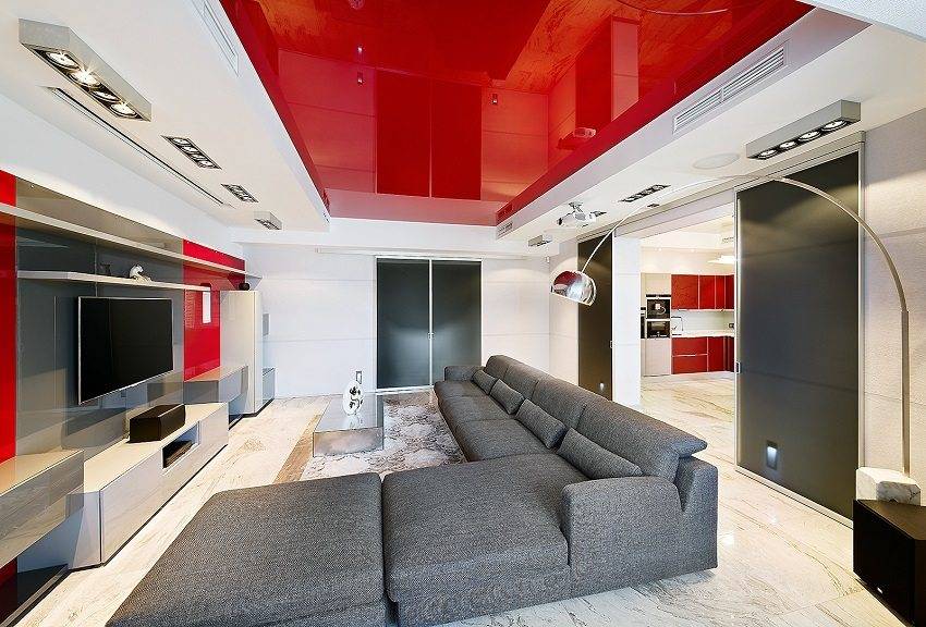 Гостиная в стиле хай-тек с темным потолкомИсточник korolev.tehnos24.ru