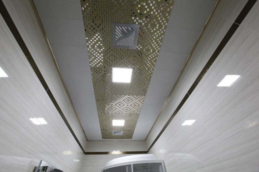 Реечный потолок. Удачное решение, особенно, если выбрать алюминий с его антикоррозийными качествами; также популярны хромированные и позолоченные реечные конструкции. Потолок смотрится стильно, служит долго, но быстро загрязняется из-за конденсата, поэтому швы нуждаются в регулярной протирке. Чтобы избежать появления плесени, ванную оборудуют вентиляцией.