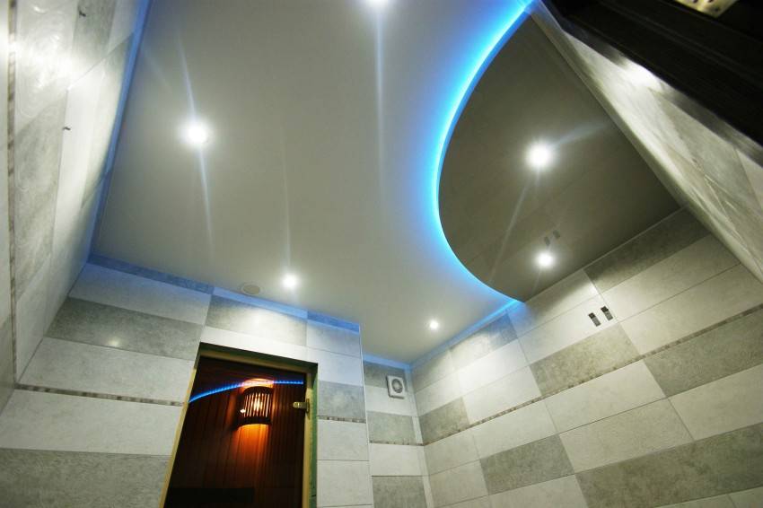 Для создания ступенчатых конструкций используются гипсокартонные короба с вырезанными в них проёмами, которые затягиваются ПВХ-плёнкой. Двухуровневые потолки подходят для ванных с большой площадью – с их помощью выделяются различные функциональные зоны.