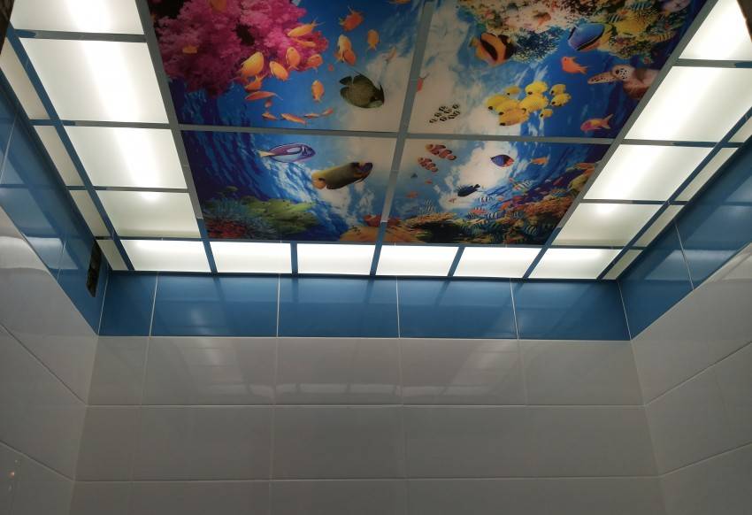 Но самые интересные эффекты создаёт натяжной потолок в ванной с фотопечатью. Он словно рождает ещё одно измерение, особенно если используется 3D-принт.