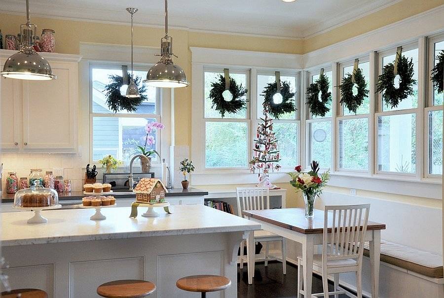 Загромождать кухню декоративными деталями не нужно, все-таки это место для приготовления еды, поэтому функциональность страдать не должна. Просто добавьте несколько небольших новогодних акцентов в комнате: